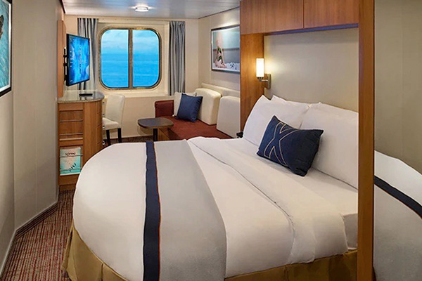 Ocean View Staterooms offer large windows with bright, airy interiors. The Prime Ocean View Stateroom provides enhanced views in a spacious setting. These staterooms are perfect for those who enjoy natural light and scenic vistas but prefer a more budget-friendly option compared to a balcony.