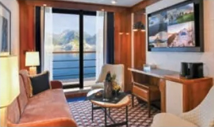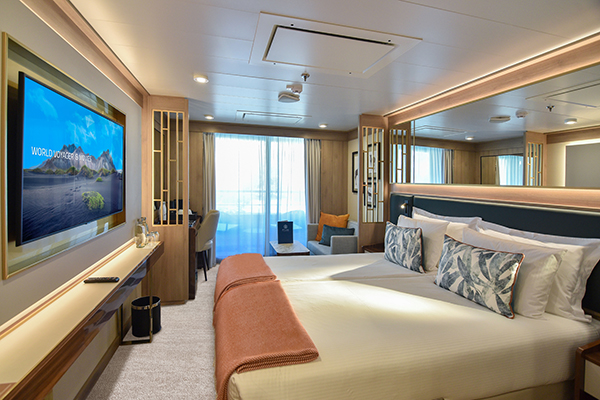 The Balcony suites aboard World Traveller offer luxurious comfort with private balconies and stunning ocean views. Featuring spacious living areas, plush queen beds, and marble bathrooms with spa showers, these suites also include modern amenities like minibars and Nespresso machines. Ideal for travellers seeking elegance, comfort, and relaxation.