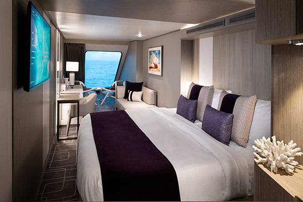Outside Staterooms aboard Celebrity Ascent offer breathtaking views and comfort. The Deluxe Ocean View and Prime Ocean View Staterooms feature expansive windows, while the Panoramic Ocean View provides even larger views. The Veranda Stateroom Guarantee offers a private balcony, and the Deluxe Porthole View with Veranda combines a unique porthole with a balcony. Perfect for those seeking scenic vistas and spacious, light-filled rooms.