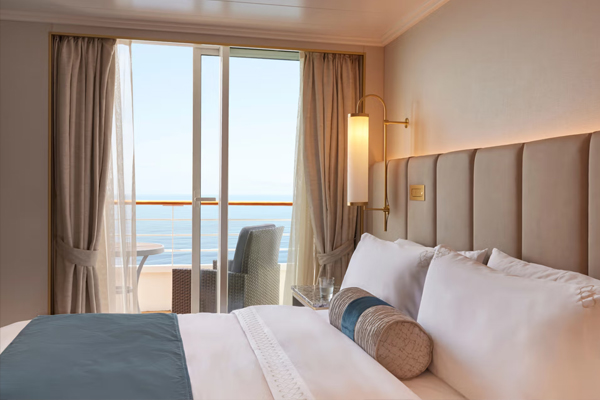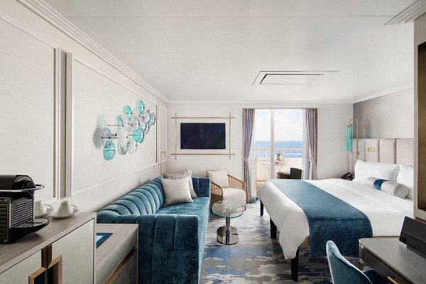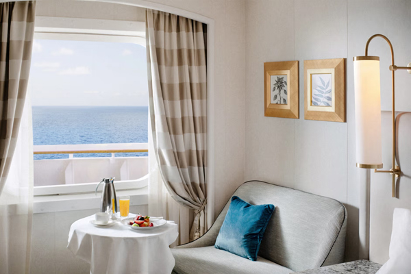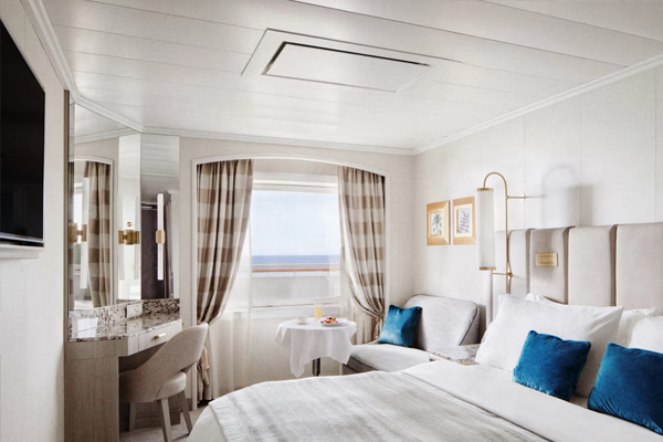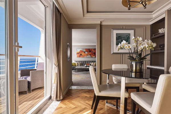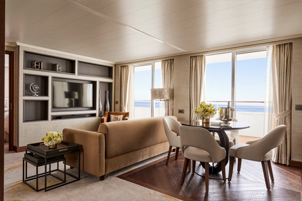 All the suites and staterooms include a sizable living area, a flatscreen entertainment system, and free unlimited WiFi. Furthermore, five of the seven categories boast a private veranda.