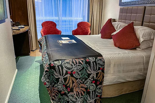 We were allocated Cabin 231, a French Balcony stateroom on Deck 2 towards the aft. While not overly spacious, the room is well-designed, featuring a queen-sized bed, crisp white linens, and floor-to-ceiling sliding glass doors that let in plenty of light and fresh air. The bathroom featured a rainfall shower and quality toiletries, and there was a good amount of hanging and shelf space in the wardrobe. Small touches, such as complimentary bottled water, umbrellas, and a daily turndown service, made it feel considered. There was even the option to change to sheets if preferred.