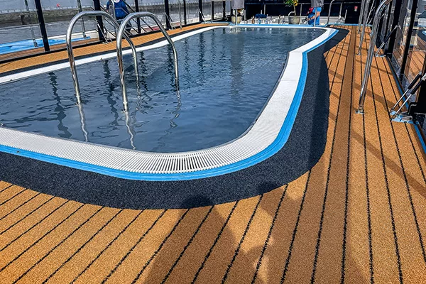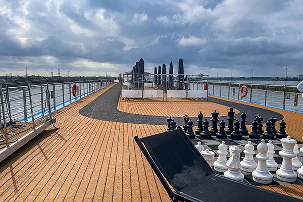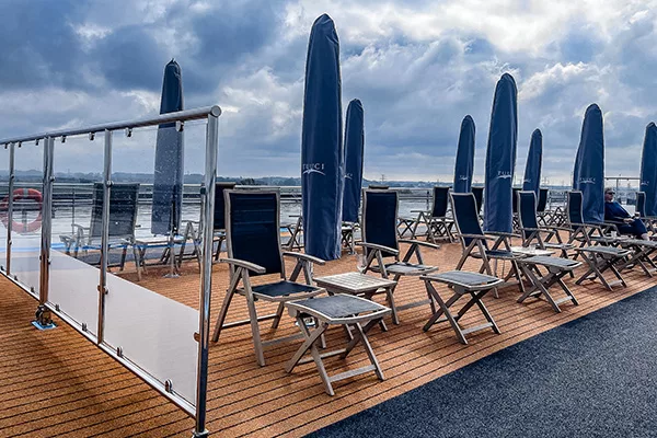 Some thoughtful features I particularly liked included the complimentary postcards posted for you at reception, hiking sticks for shore excursions and reading glasses available if needed. The pool is open into the night, and while the swim-up bar was not used much, the space itself added to the ship’s relaxed charm.