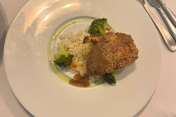Before the night started, I enjoyed dinner at the Lesboa Restaurant, starting with the delicious Arancini balls for starters. I couldn’t decide on a main course, so I ordered both—the breaded chicken on a bed of rice and seasoned vegetables and the mouthwatering tofu noodles with vegetables. The meal’s highlight was undoubtedly the pistachio mousse with fruits and a sprinkle of white chocolate—it was absolutely divine!