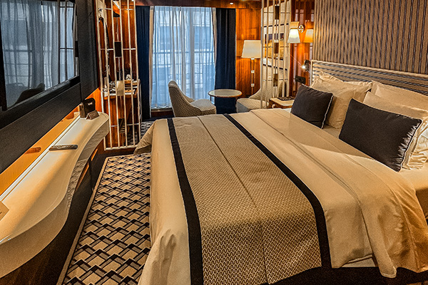 I was assigned a Veranda Stateroom on Deck 6, room #623, boasting a spacious balcony. This 270-square-foot cabin featured a roomy bathroom, double-bed with storage space underneath for my luggage, a generous wardrobe space, a comfortable living area, and a small desk with two chairs. In the spacious bathroom, the rain head shower was a standout feature, equipped with body jets and stocked with L’Occitane products.