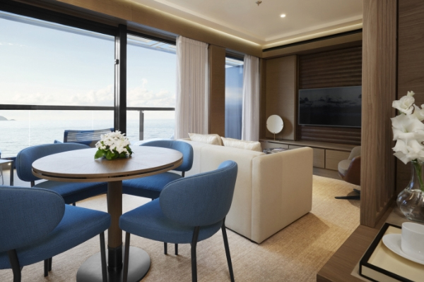As standard, every suite offers the same amenities, including an espresso machine, a personal safe, and storage space. In addition, the bathroom facilities offer either a shower-over-bath or a separate shower and tub, depending on your chosen suite category. The two-storey Loft Suite is perhaps Evrima’s most eye-catching suite, while the elegant Owners Suite offers an additional bedroom and a sophisticated penthouse-style layout.