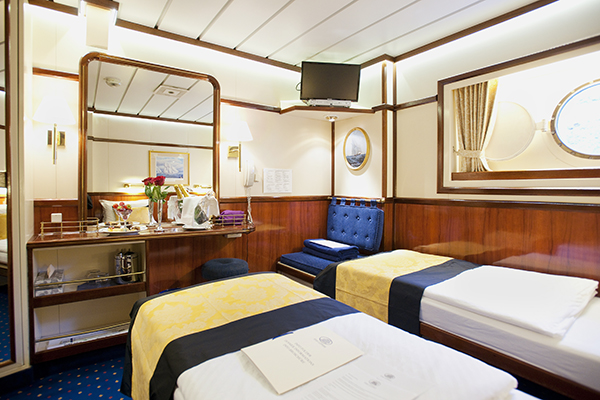 Located on the Main Deck, the Category 1 Deluxe Outside Cabins provide direct access to the ship’s open decks, allowing you to easily step outside and enjoy the fresh sea air. These cabins feature a marble-lined bathroom and a spacious seating area, offering an elevated level of comfort.