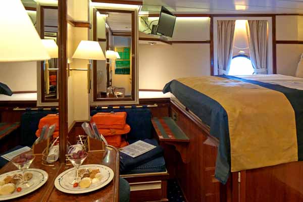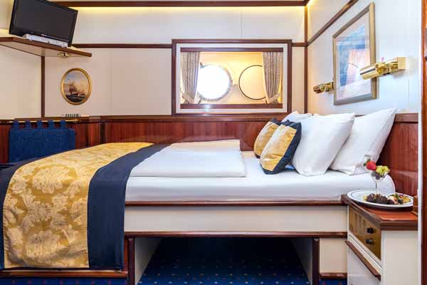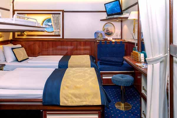 The Category 3 Outside Cabins on Star Flyer features a porthole that allows natural light to fill the room. They also have comfortable double or twin beds. These cabins offer a cosy and intimate space to relax while enjoying the sights and sounds of the sea.